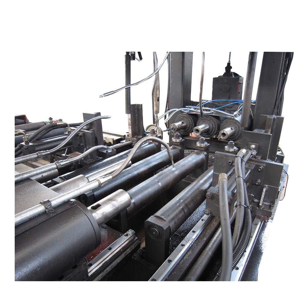 本機床主要用于H型鋼、槽鋼和箱型梁的鉆孔加工,廣泛用于立體車庫、鋼結(jié)構(gòu)建筑、橋梁、塔桅和網(wǎng)架等行業(yè)。4軸數(shù)控型鋼三維鉆床采用四個伺服電機實現(xiàn)2個垂直方向、1個水平方向和1個長度的鉆孔定位。3個鉆孔面上,每個面有3個鉆孔主軸,每個面上的3個鉆孔主軸由一臺變頻電機驅(qū)動,鉆孔主軸為自控行程鉆孔主軸,工件一次通過設(shè)備后三個面上的孔均可加工完畢,效率高,孔位精度高,是鋼結(jié)構(gòu)制造業(yè)中保證質(zhì)量的必不可少的設(shè)備。